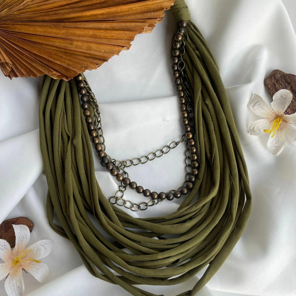 O Colar Maya é uma peça de estilo marcante e moderno, com um visual que mistura materiais e texturas. Ele é composto por várias tiras de tecido, que se sobrepõem em camadas, criando um efeito volumoso e envolvente. Entre as tiras de tecido, há correntes metálicas e esferas em tom ouro envelhecido, que adicionam contraste e sofisticação à composição.